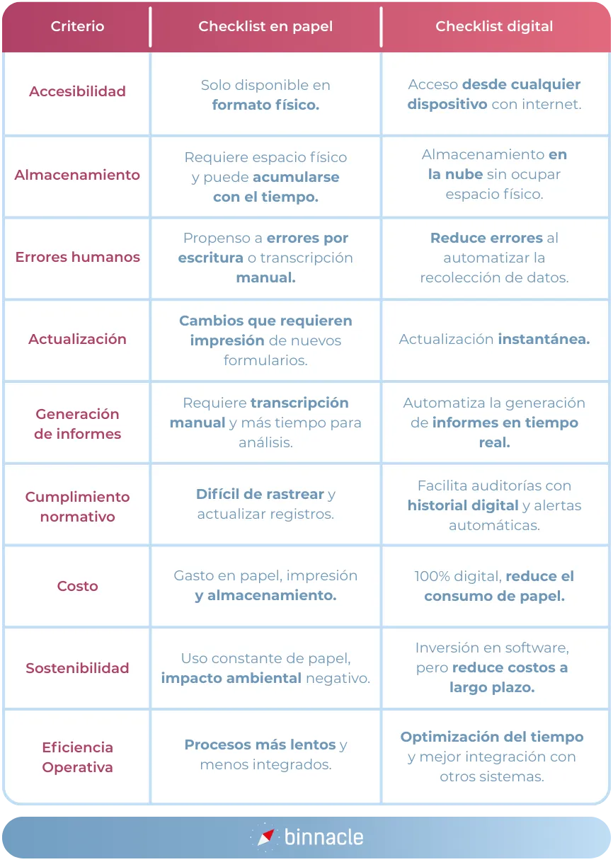 Los checklists en papel son una opción ampliamente utilizada debido a su simplicidad y facilidad de implementación. Son fácilmente accesibles y no requieren de tecnología avanzada, lo que puede ser una ventaja en entornos donde los recursos digitales son limitados. Sin embargo, tienen ciertas limitaciones que pueden afectar la eficiencia de su uso: